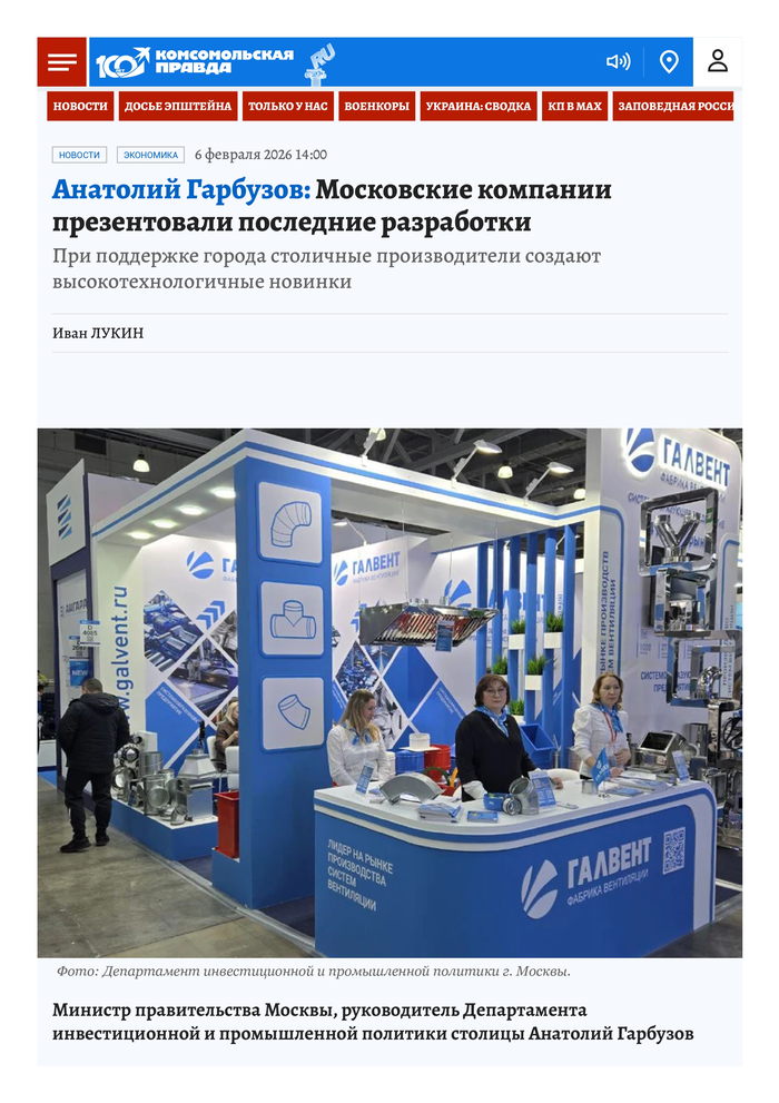 Министр правительства Москвы, руководитель Департамента инвестиционной и промышленной политики столицы Анатолий Гарбузов рассказал о представленных городскими компаниями нескольких передовых разработках. В их числе - производители промышленного оборудования, например, вентиляционных, отопительных и информационных систем. В феврале в Москве проводятся несколько промышленных выставок, среди которых Aquaflame2026, посвященная бытовому оборудованию для отопления, водоснабжения и инженерно-сантехнических систем, а также AIRVent 2026 с экспозицией технологий для вентиляции и кондиционирования.
